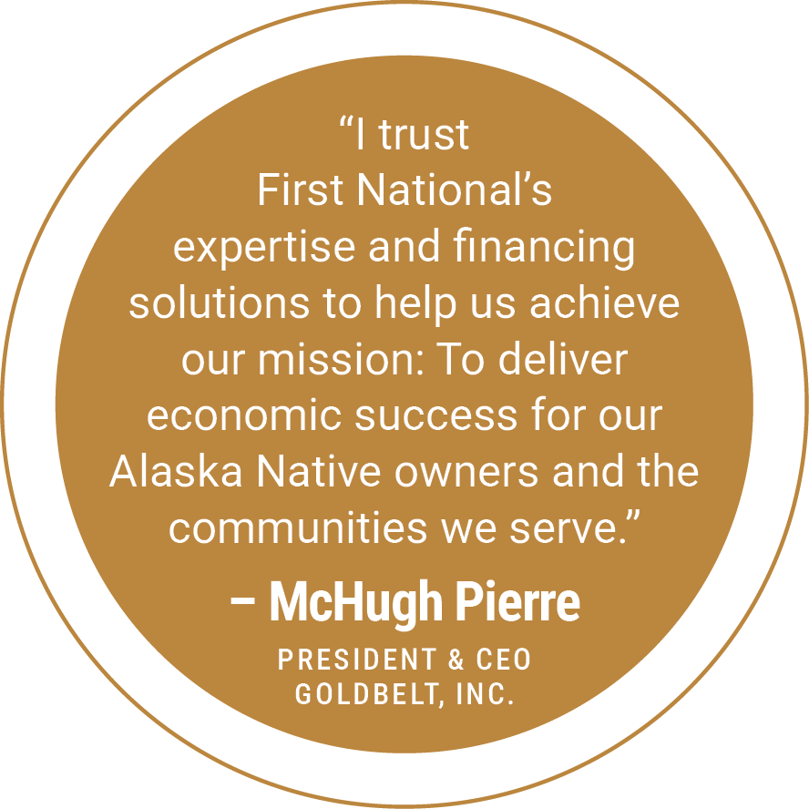 Alaska Native businesses like Goldbelt drive economic growth benefiting both shareholders and their communities. First National Bank Alaska delivers the One Solution — a comprehensive suite of financial tools — to help them succeed, all backed by the experience of Alaska’s largest community bank.